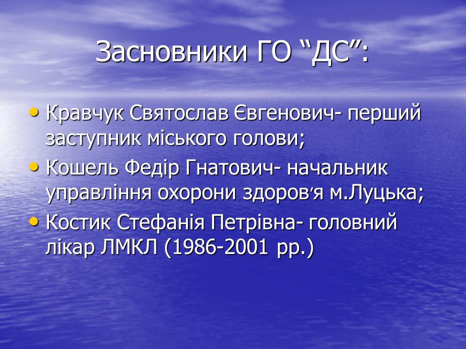 Приємно відмітити той факт, що керівництво міста приймає активну участь в діяльності ГО «Допоможемо собі». Засновниками ГО «ДС»- Кравчук Святослав Євгенович – заступник міського голови, – Кошель Федір Гнатович- начальник управління охорони здоров’я міста Луцька; - Костик Стефанія Петрівна,-заслужений лікар України, яка першою із керівників лікувальних закладів міста підтримала цю ідею.