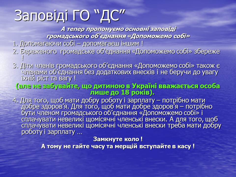- Для того, щоб мати добру роботу і зарплату – потрібно мати добре здоров’я. Для того, щоб мати добре здоров’я – потрібно бути членом громадського об’єднання «Допоможемо собі» і сплачувати невеликі щомісячні членські внески. А для того, щоб сплачувати невеликі щомісячні членські внески треба мати добру роботу і зарплату. Замкнуте коло ! А тому не гайте часу та мерщій вступайте в касу !