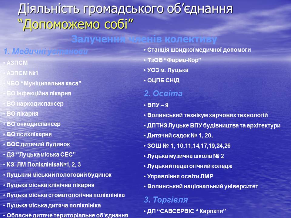 З лікувальними закладами міста та області укладені договори щодо проведення лабораторно діагностичного обстеження та лікування членів об’єднання, а саме :