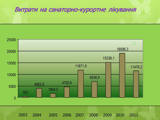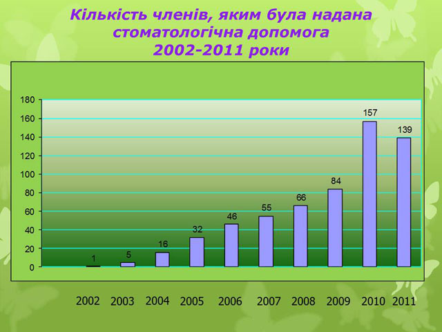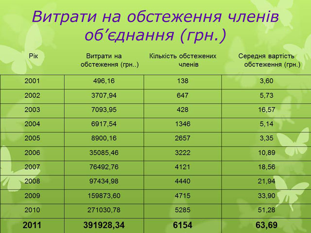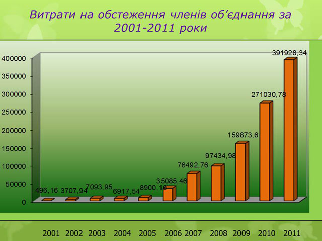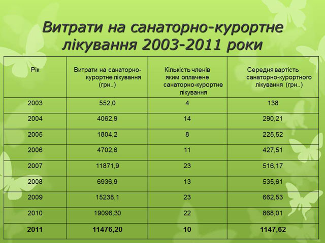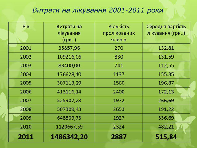 За 12 місяців 2011 року організація витратила на лікування, обстеження, санаторно-курортне лікування та стоматологічні послуги членів об’єднання кошти на суму 2004,7 тис. грн., а саме: