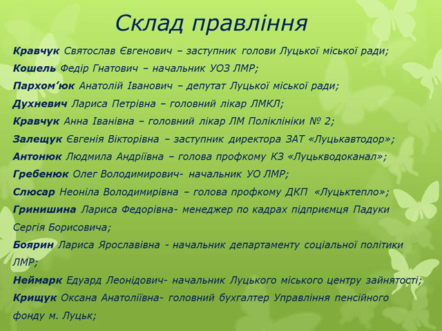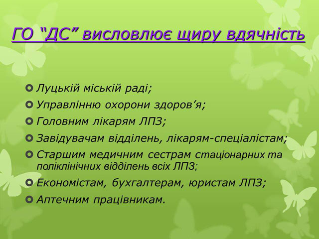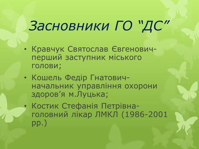 Приємно відмітити той факт, що керівництво міста приймає активну участь в діяльності ГО «Допоможемо собі». Засновниками ГО «ДС»- Кравчук Святослав Євгенович – заступник міського голови, – Кошель Федір Гнатович- начальник управління охорони здоров’я міста Луцька; - Костик Стефанія Петрівна,- заслужений лікар України, яка першою із керівників лікувальних закладів міста підтримала цю ідею.